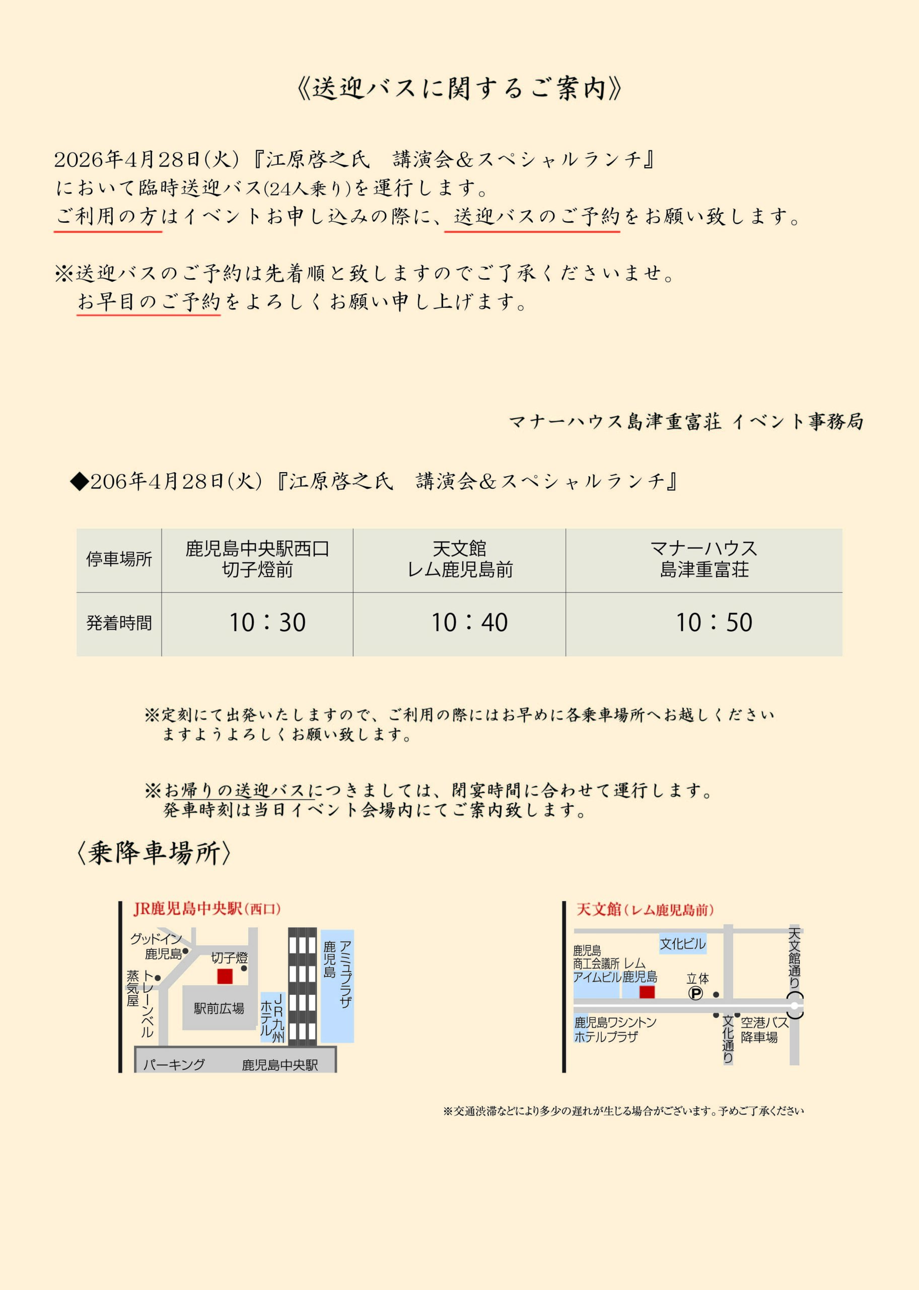 ※送迎バスのご予約は先着順と致しますので