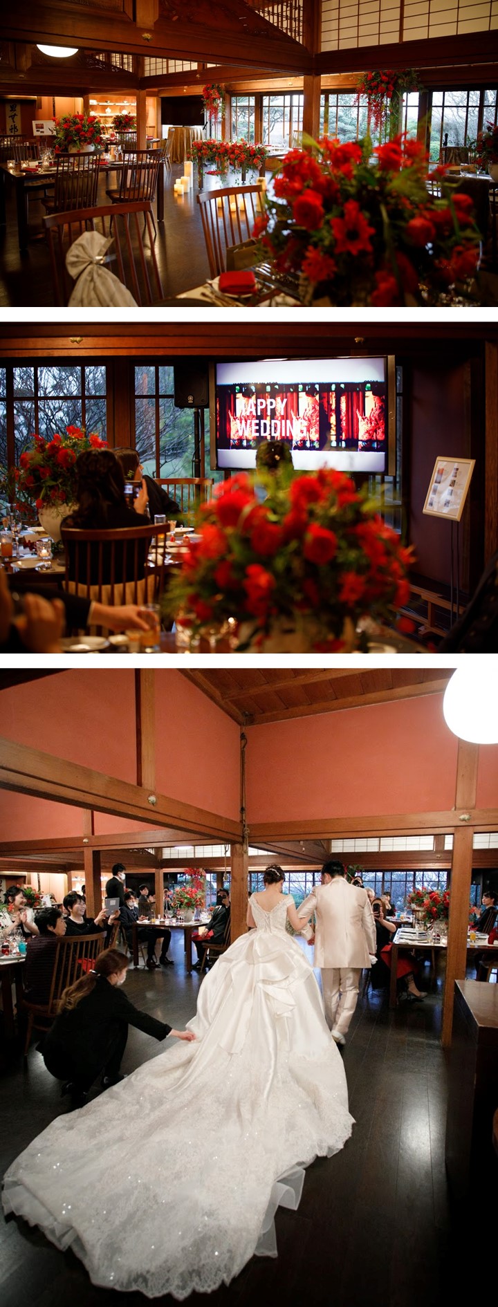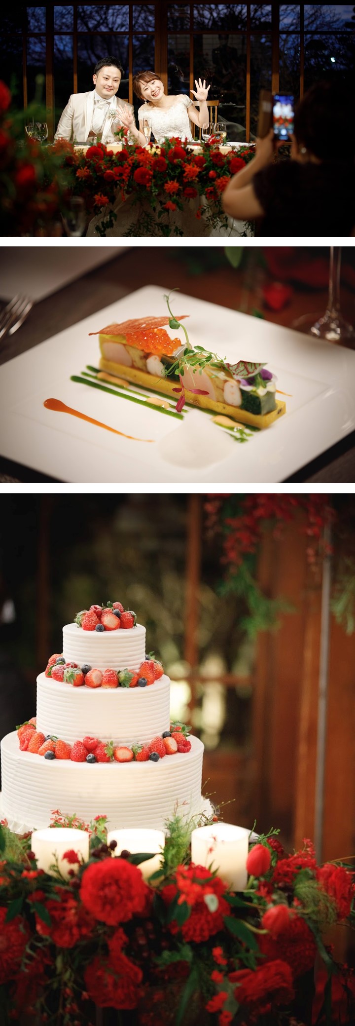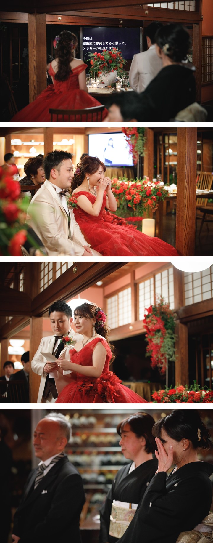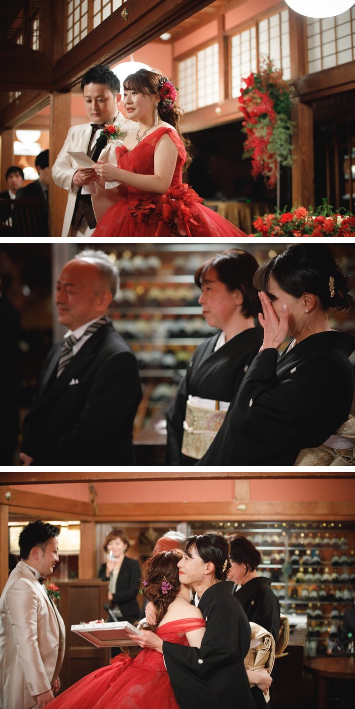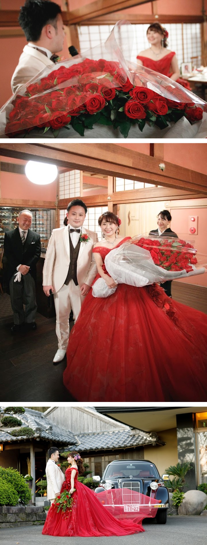 ゲスト想いのおふたりがこだわったのは 感謝の気持ちを込めた”おもてなし” 温かな光が灯るキャンドルと真っ赤な装花で彩った 貴重建築の空間で大切なゲストをお迎えし 食材にこだわったお料理と共に過ごす笑顔溢れるひと時 披露宴終盤ではご友人からのビデオメッセージをはじめ 鮮やかな赤色のドレスに身を包んだ新婦様へ 新郎様から99本のバラの花束をプレゼントされるなど サプライズで感動溢れる1日となりました
