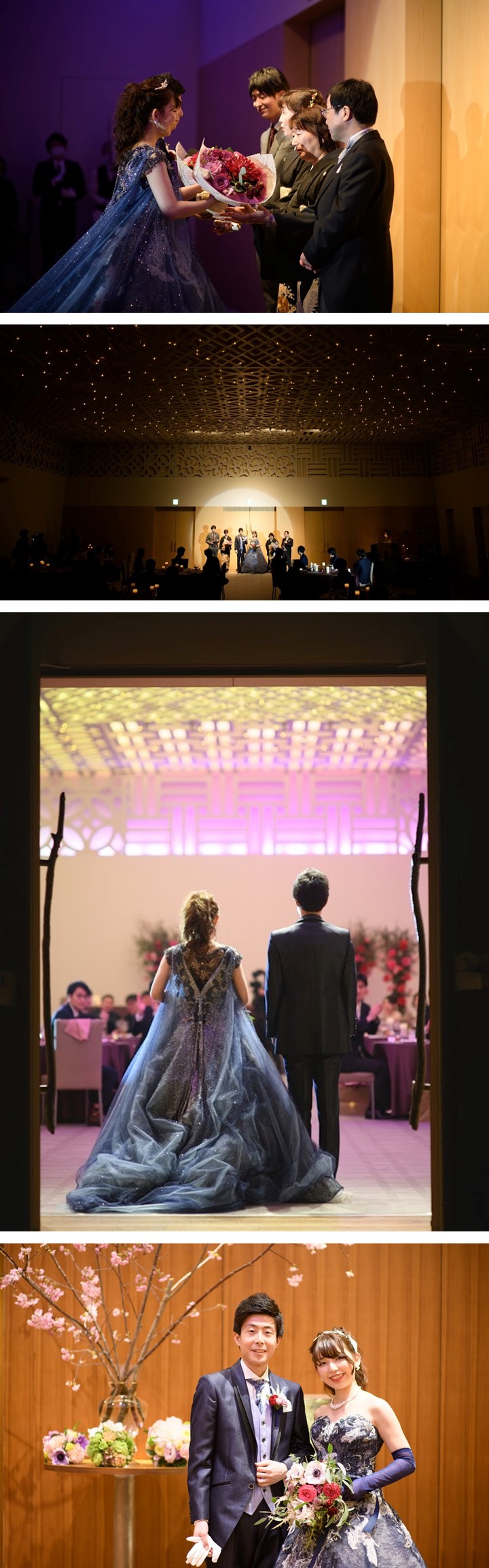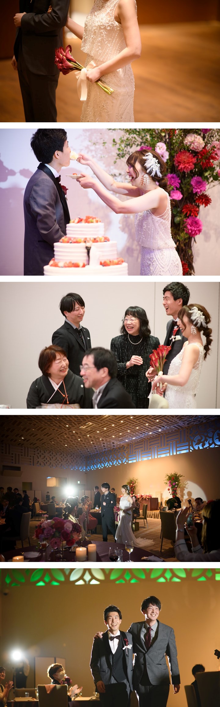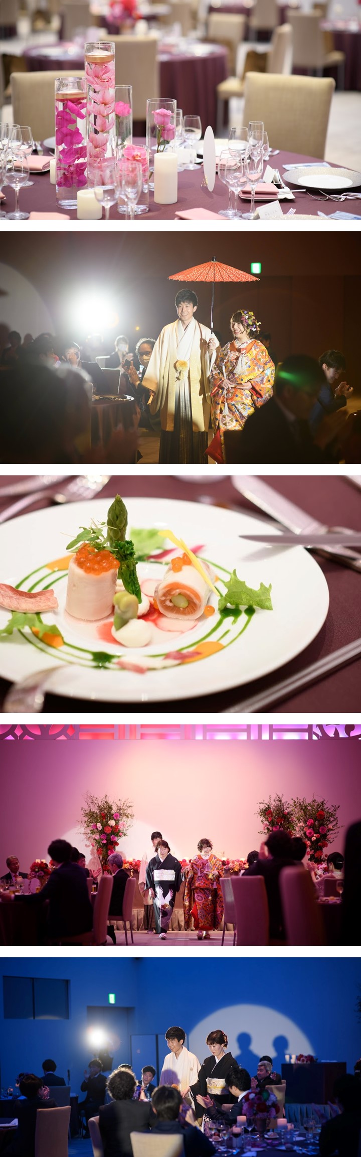 会場内はダリアやバラ、胡蝶蘭の華やかなアレンジで彩られ
