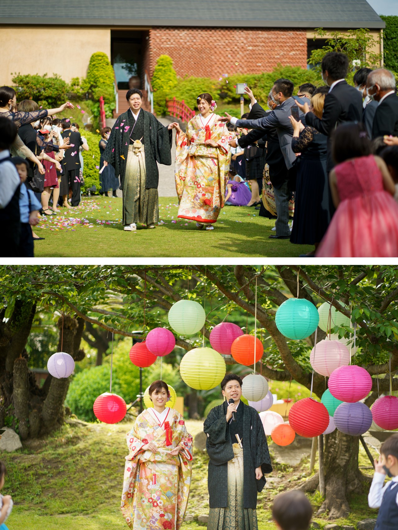 庭園に映える和装で 装花や演出アイテムも和のイメージに合わせて華やかに